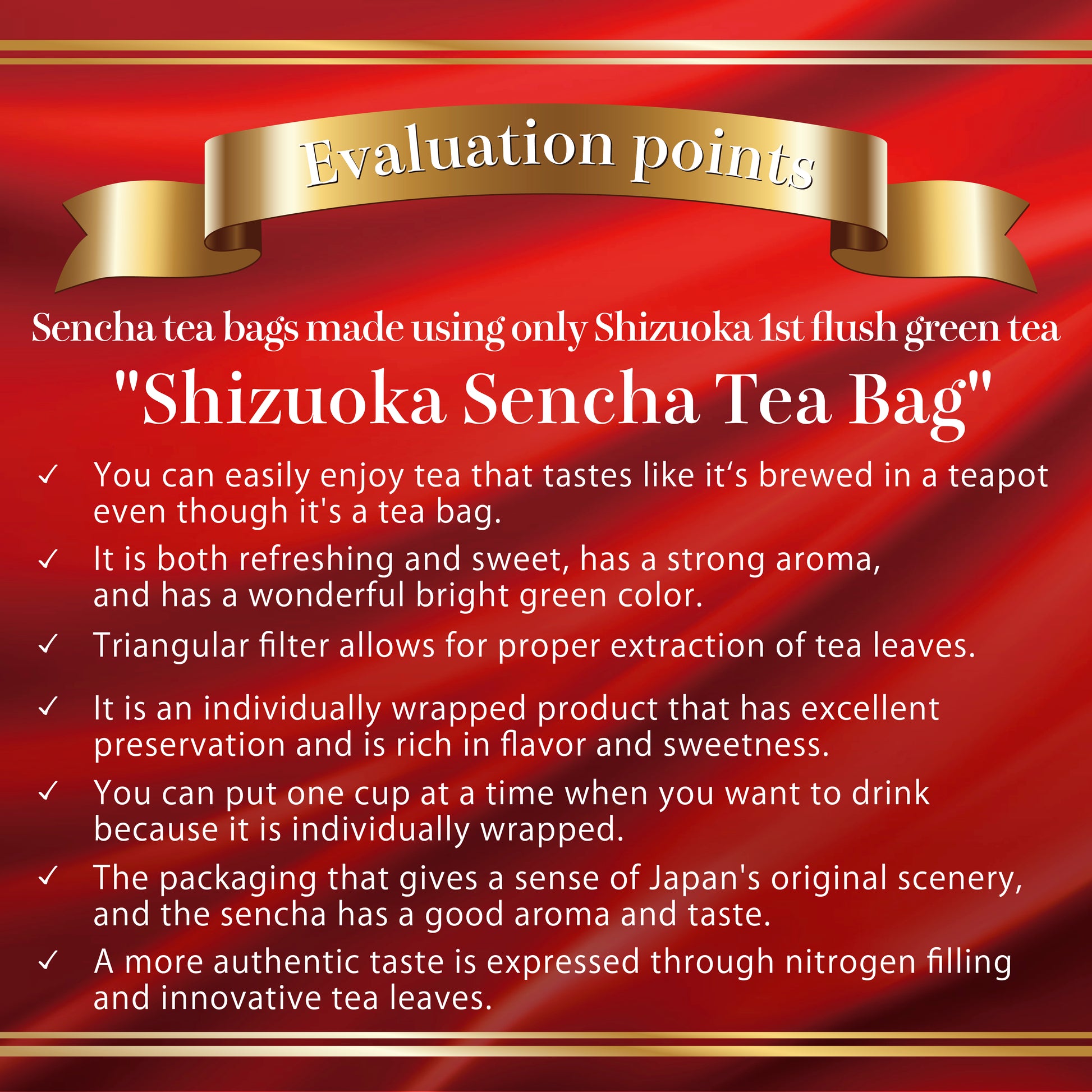 Using first flush tea leaves from Shizuoka. With pyramid shaped tea bags, its flavor is close to the tea brewed in a teapot. Enjoy its taste of deep steamed green tea.